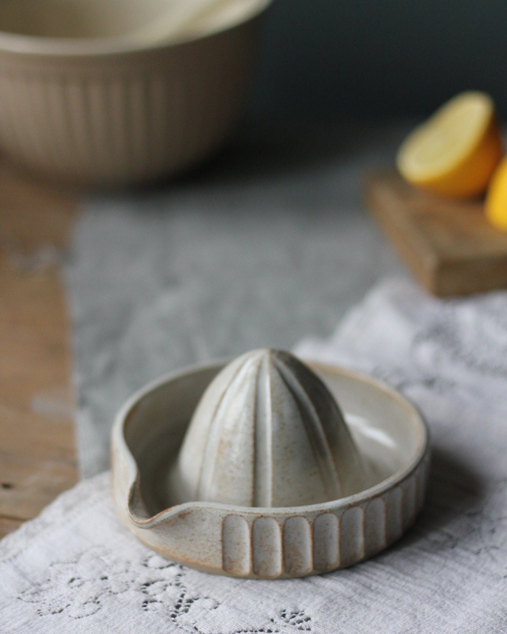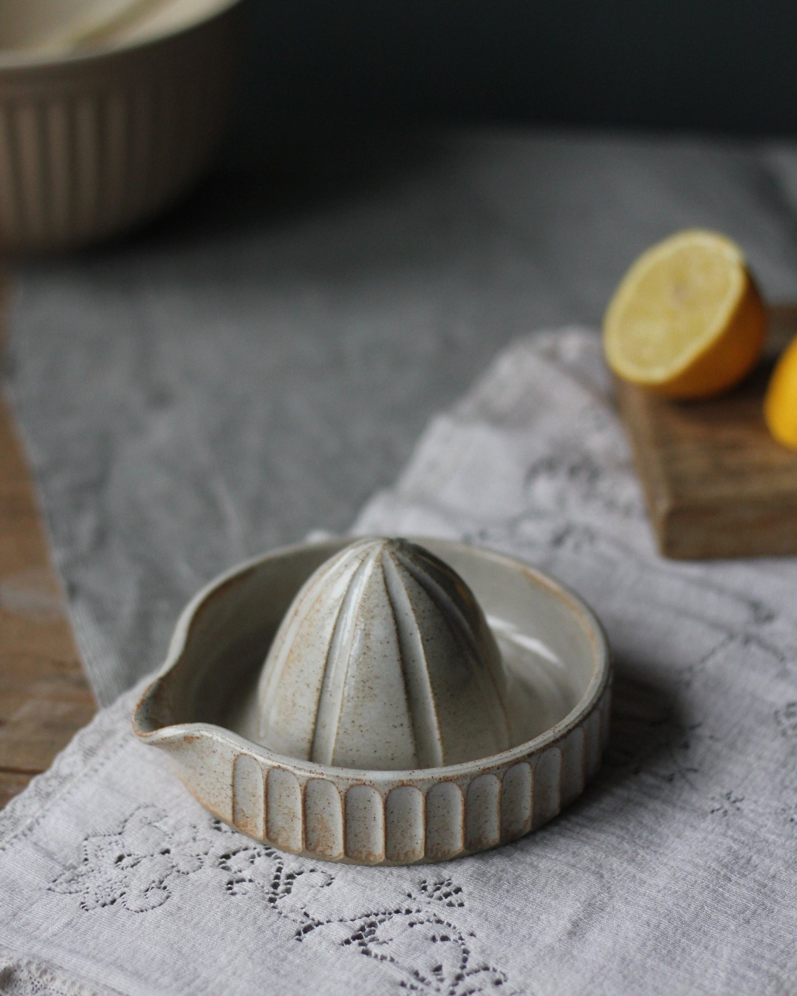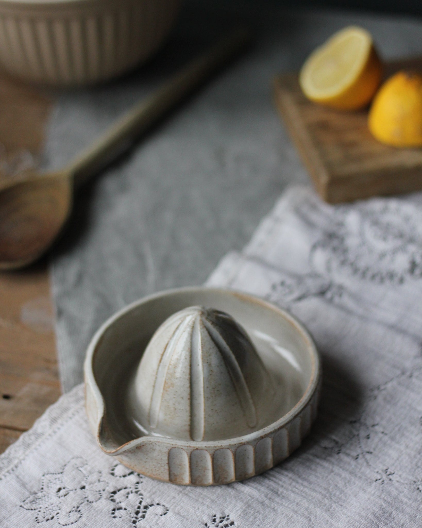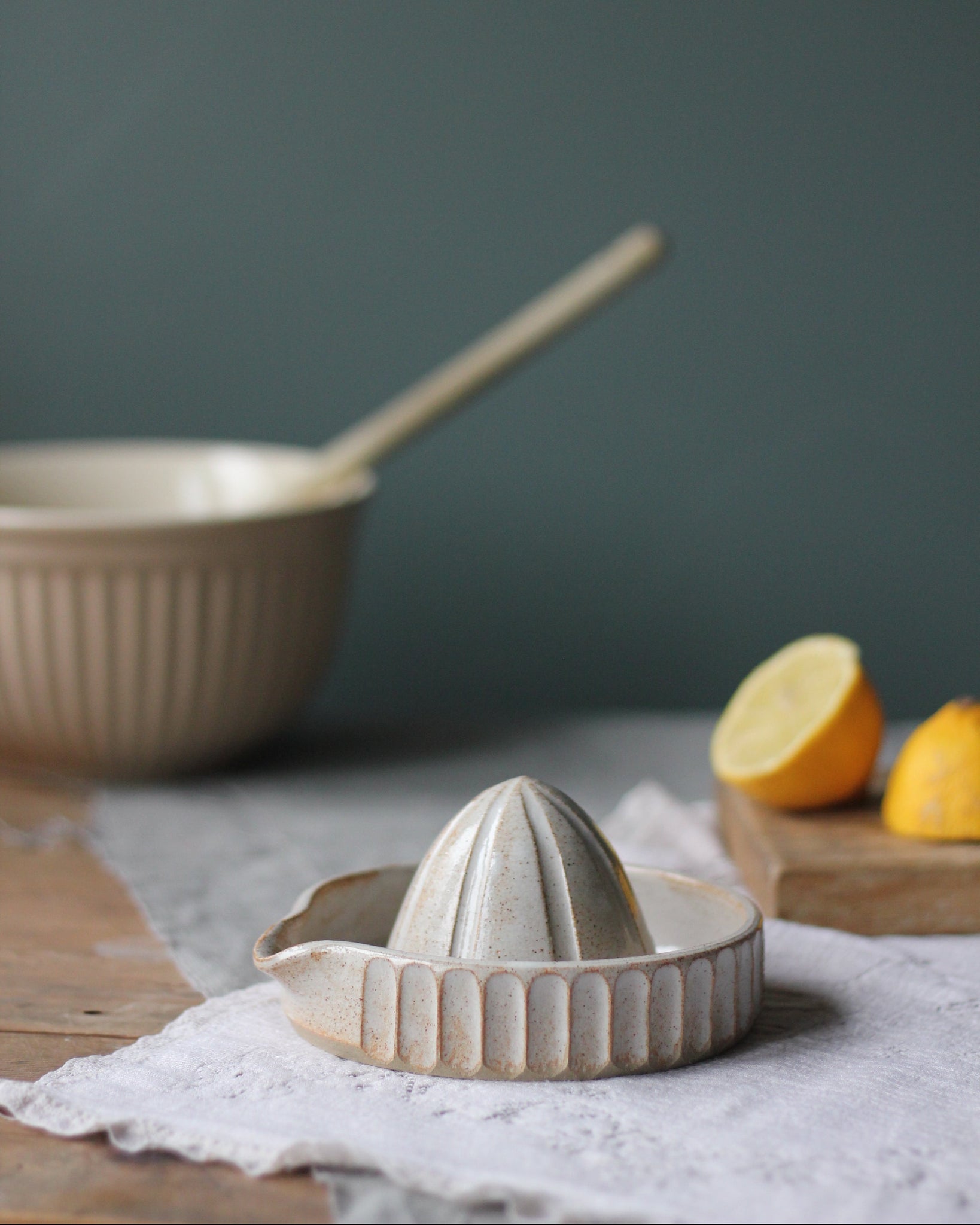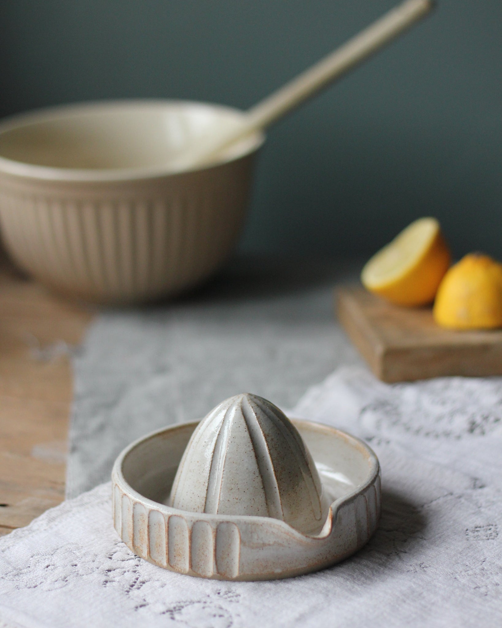 Stoneware lemon squeezer with hand-carved design and a glossy, oatmeal glaze.