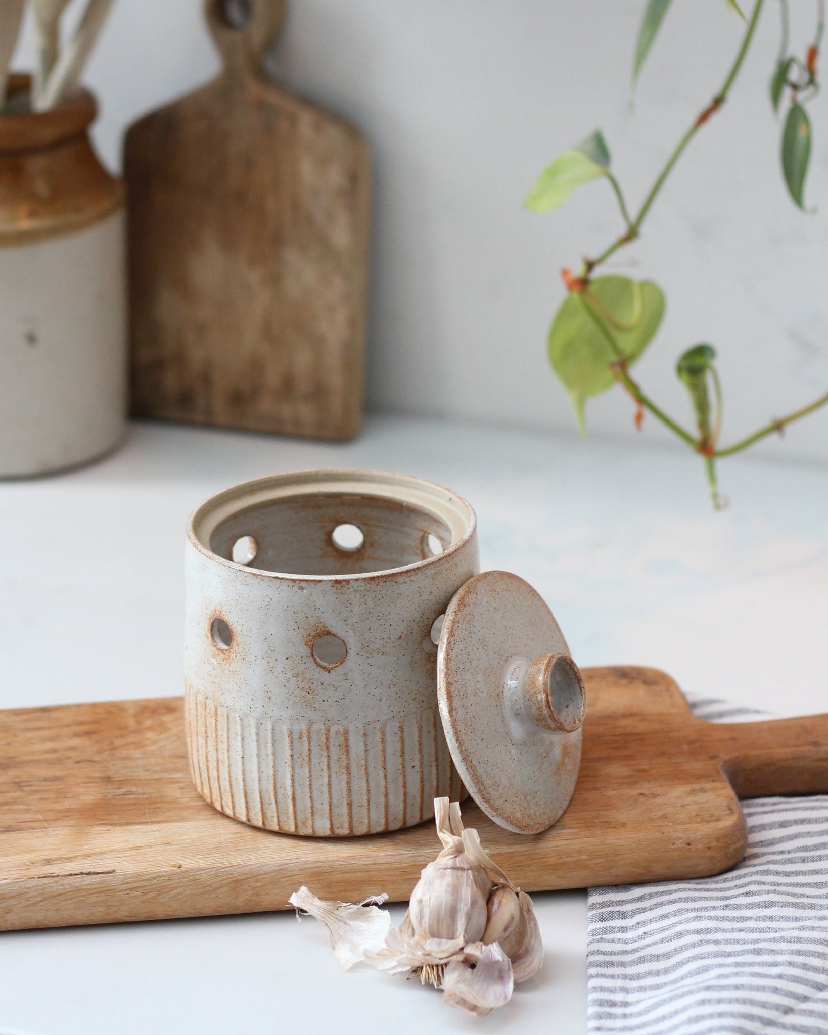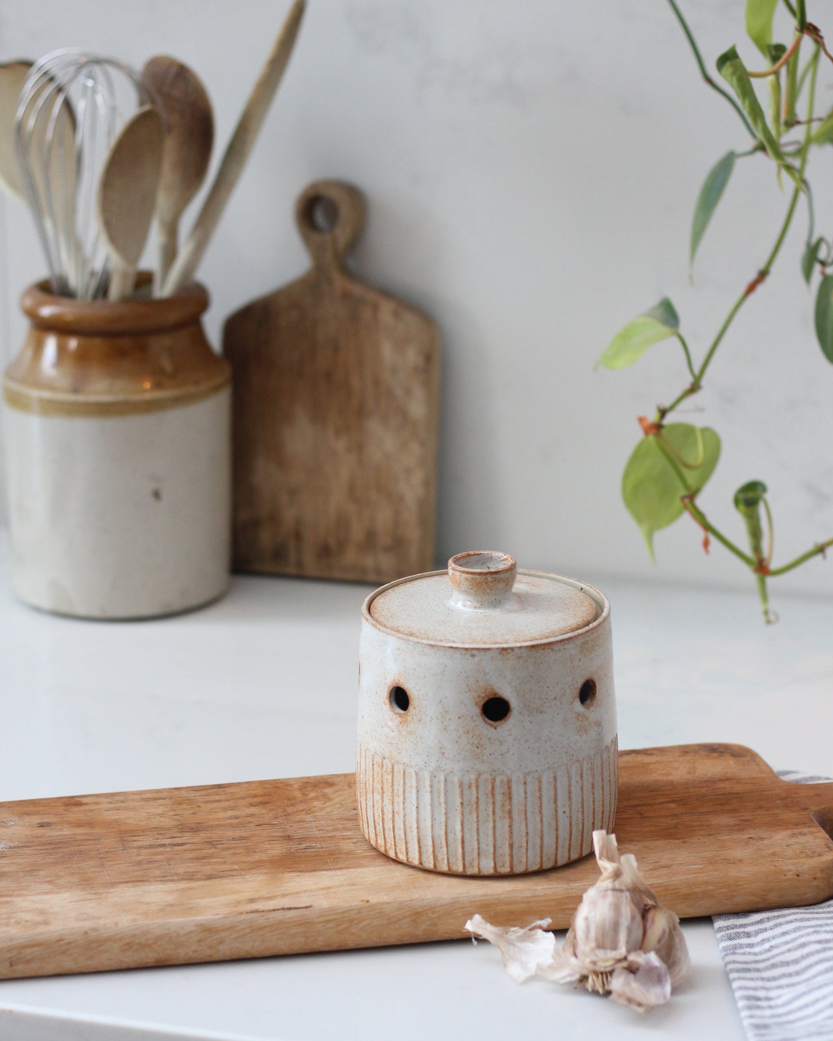 A stoneware lidded jar with ventilation holes - perfect for keeping garlic fresh. Finished in a glossy, variated, off-white glaze.