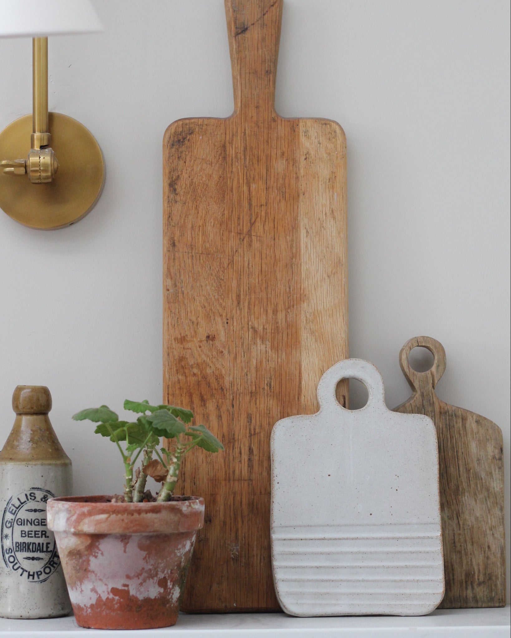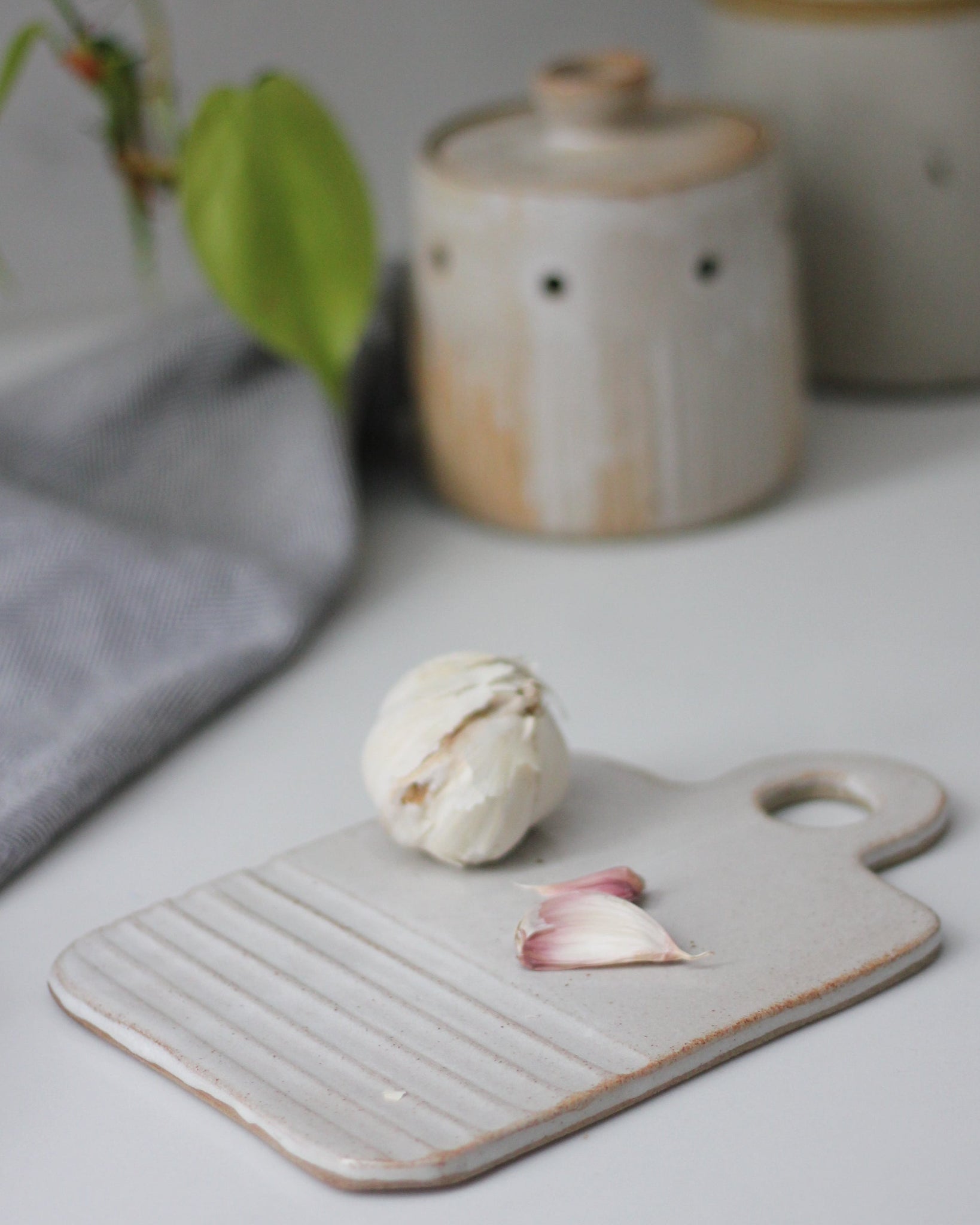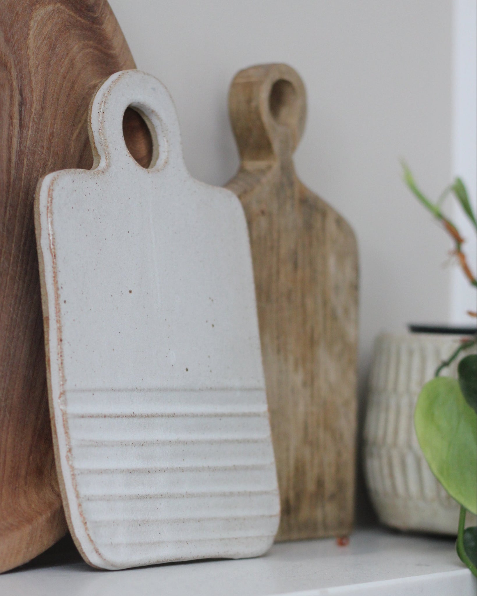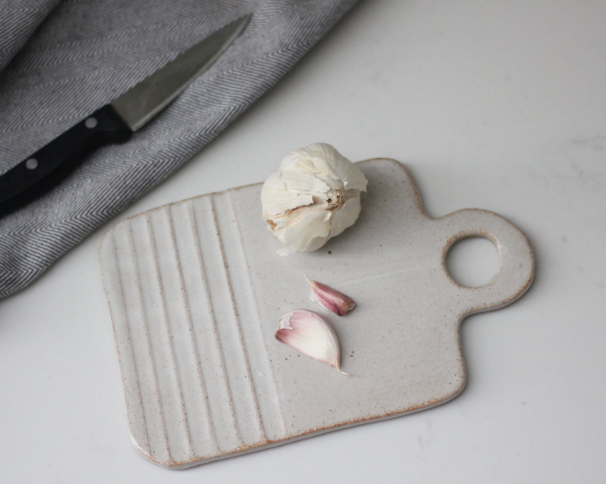 A stoneware chopping board with hand-carved design and a glossy, off-white finish.