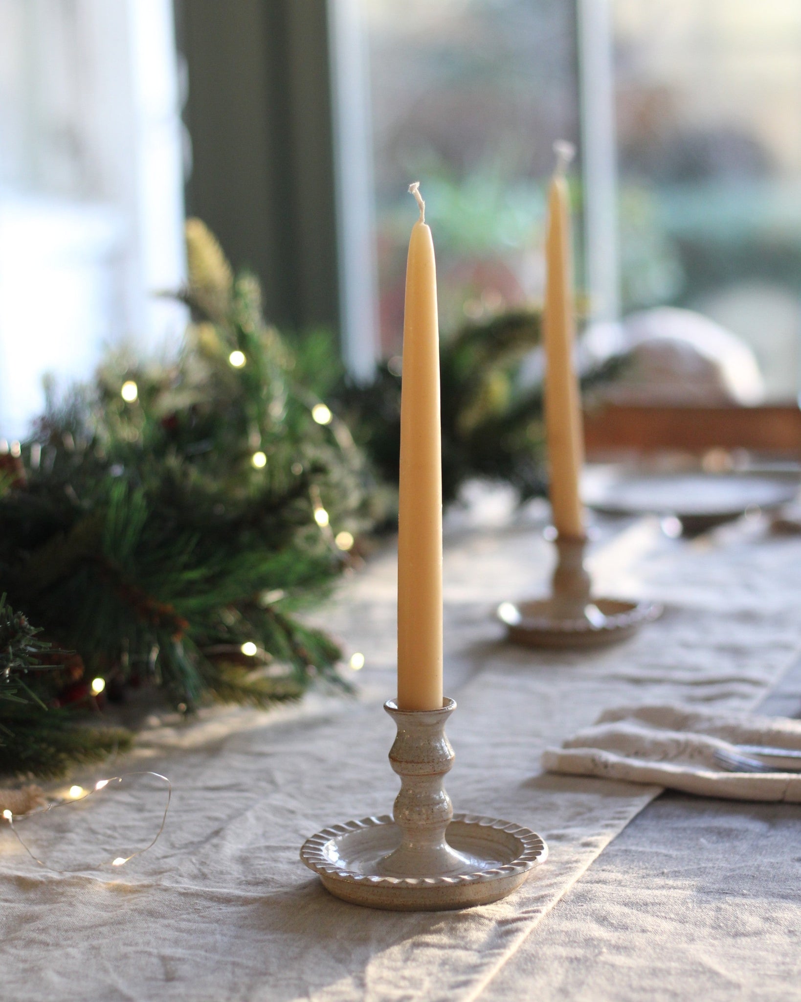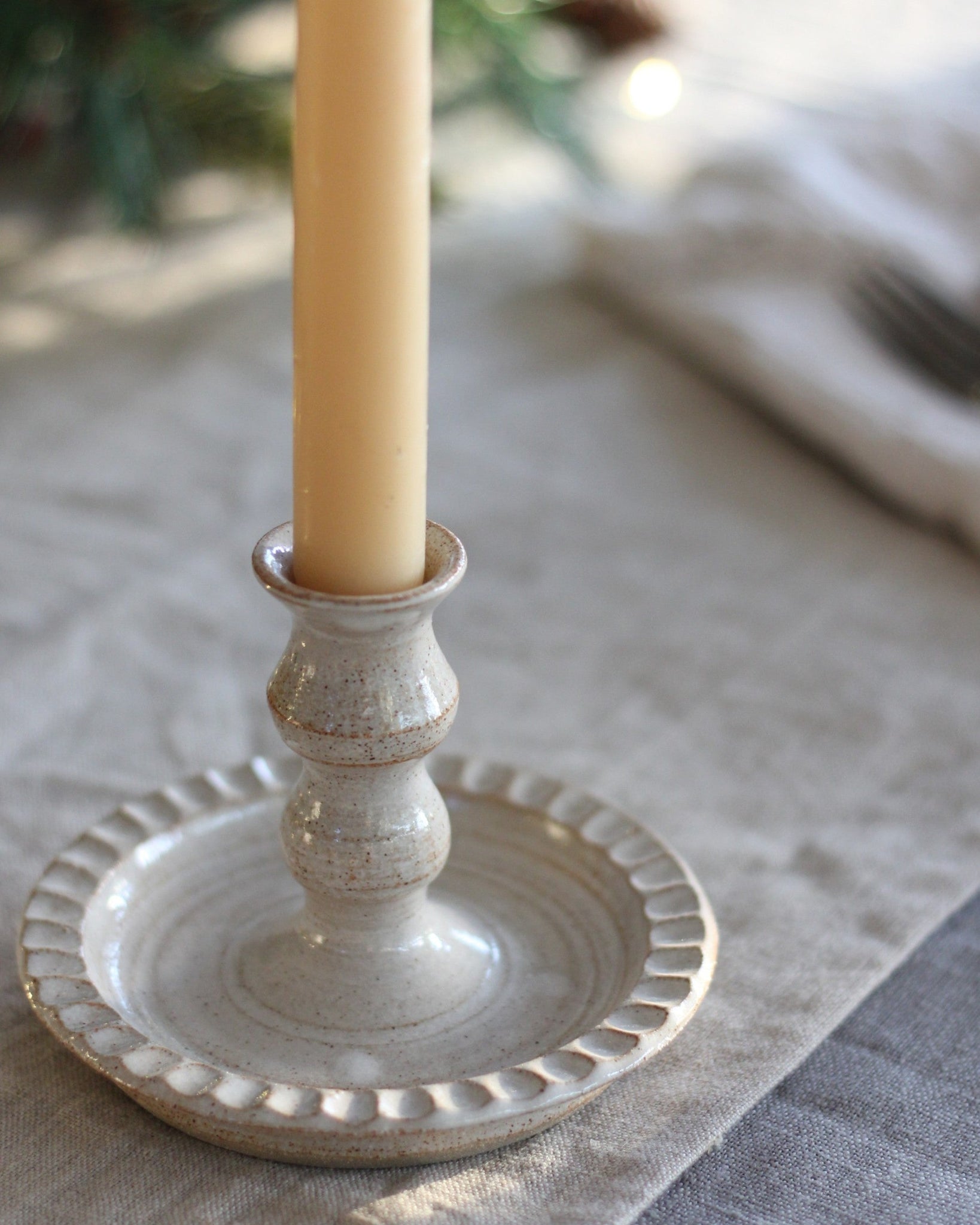 A stoneware candle holder with a hand-carved design and a soft, off-white, matt finish.