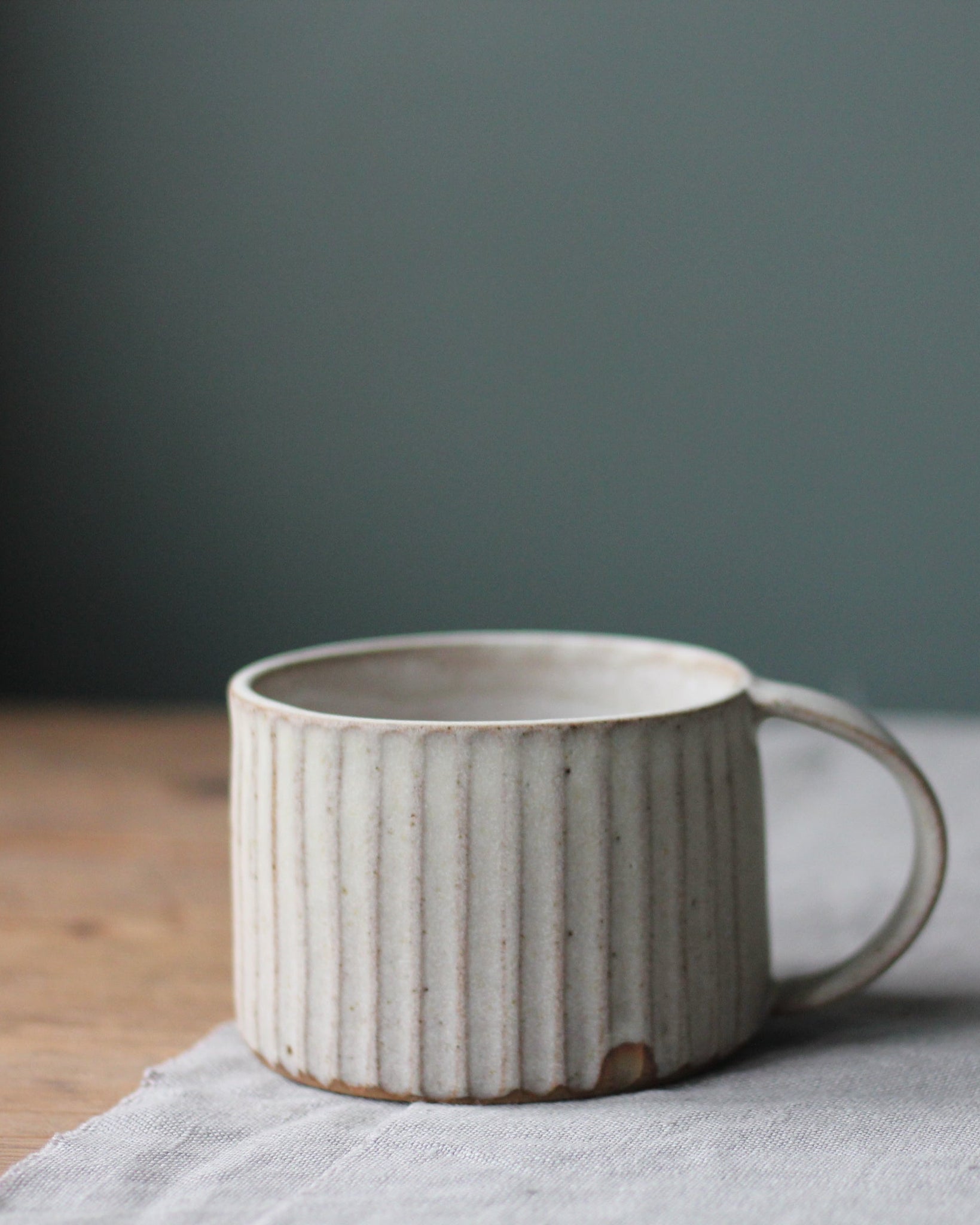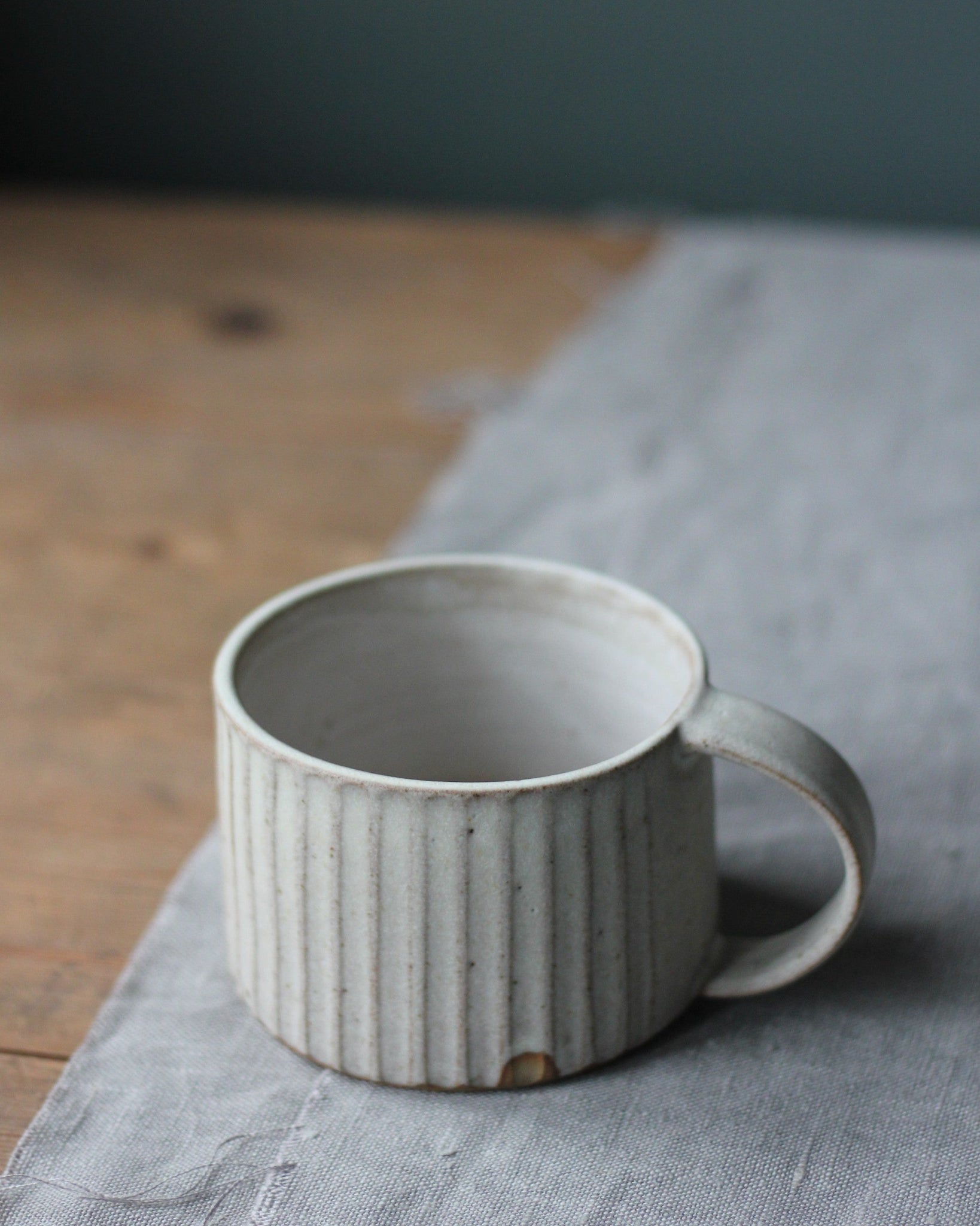 A stoneware mug with a soft, matt, off-white finish and hand-carved design.