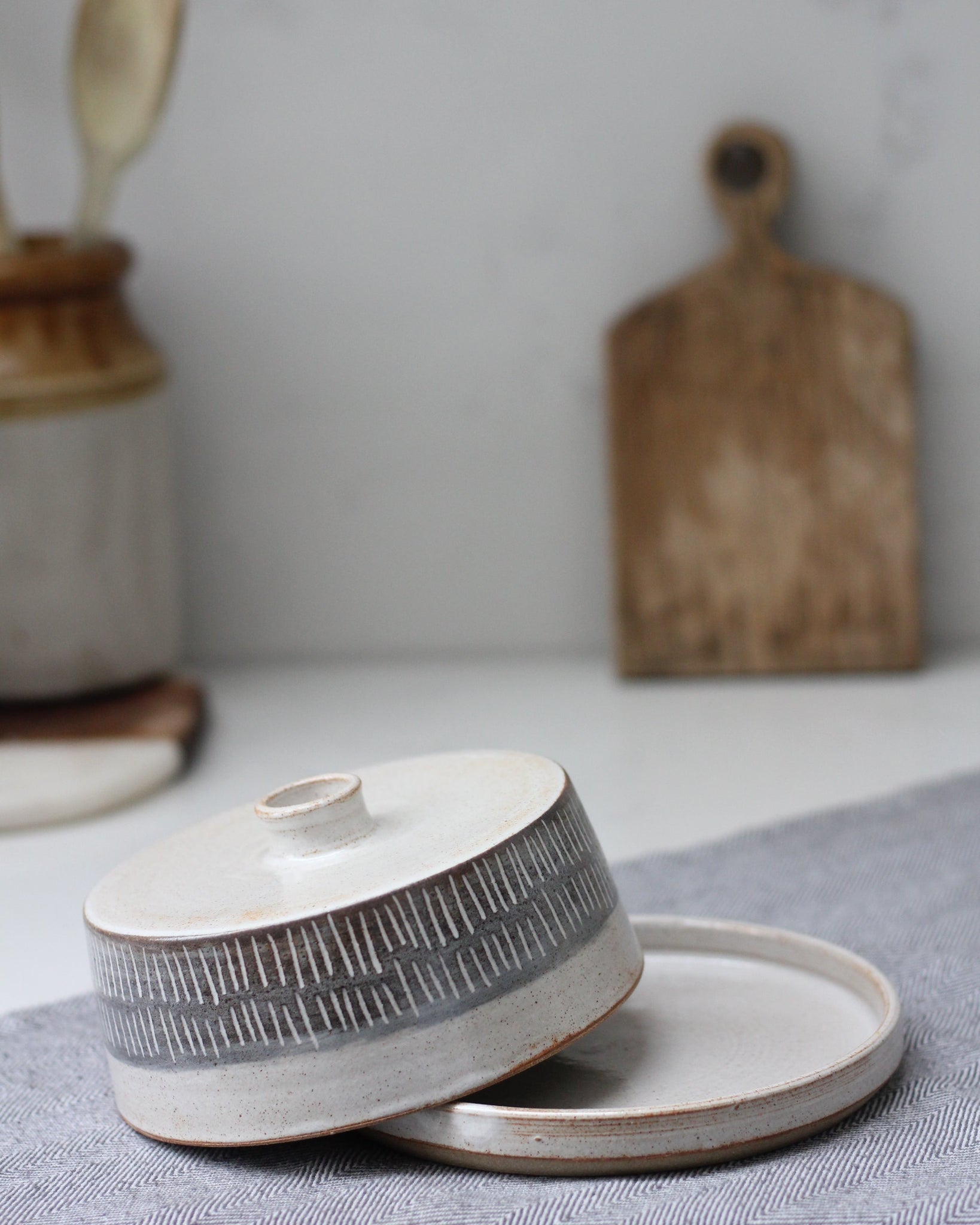 A stoneware butter dish with hand-carved design and a glossy off-white and grey finish.