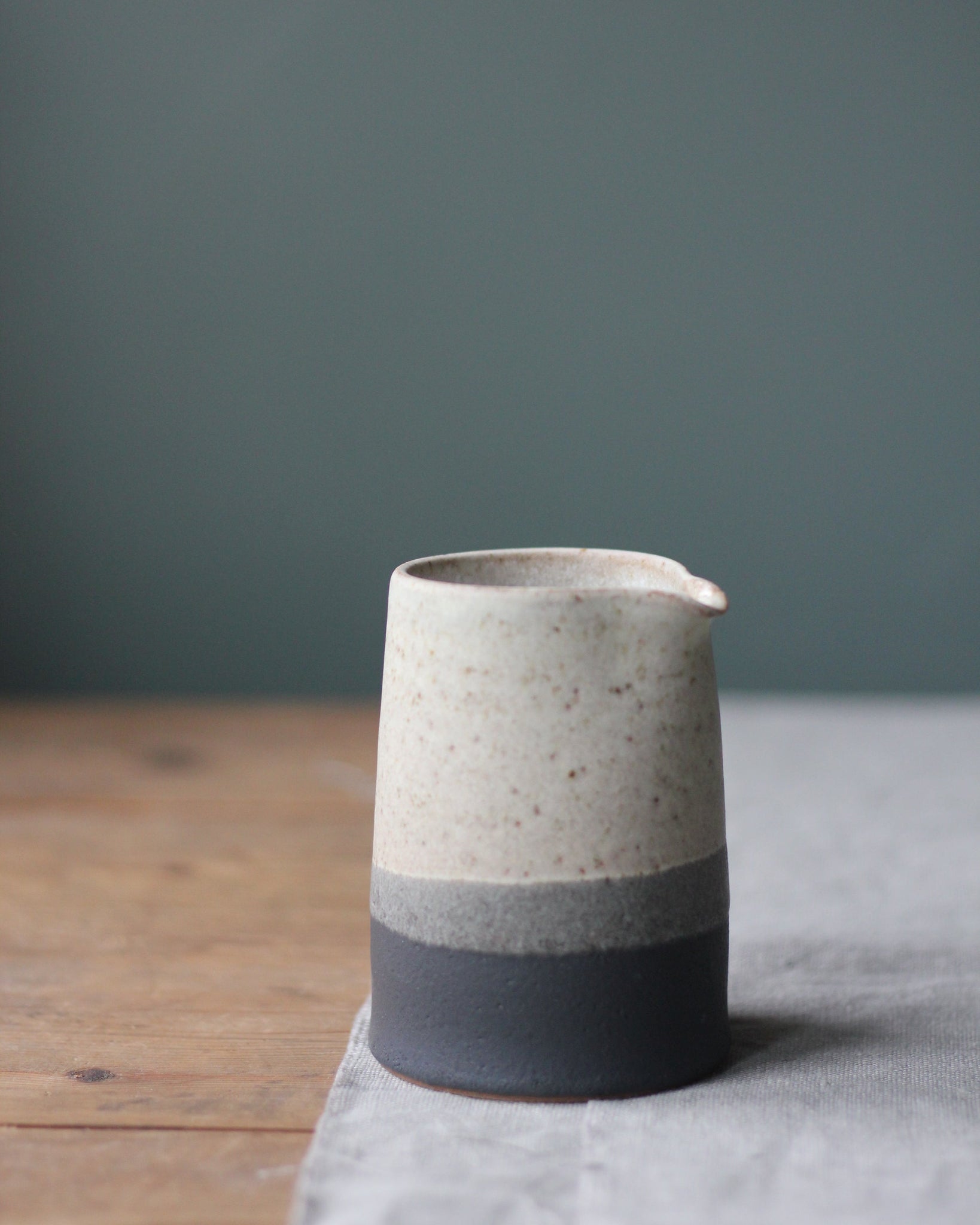A hand-thrown, stoneware pourer with a matt charcoal and white finish.